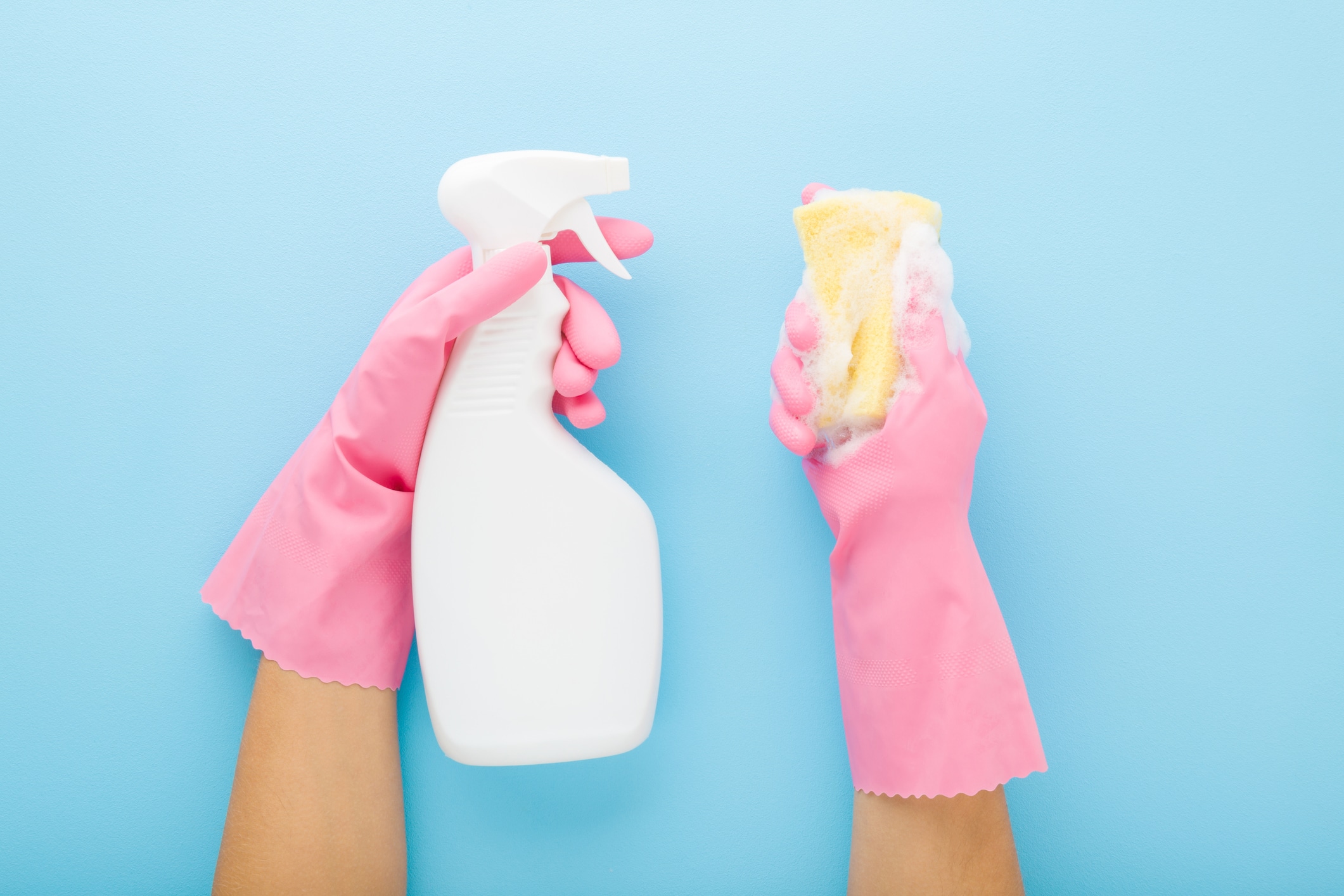 Hands In Rubber Protective Gloves Holding White Spray Bottle And Foamy Sponge. Detergent For Different Surfaces In Kitchen, Bathroom And Other Rooms. Pastel Blue Background. Point Of View Shot.