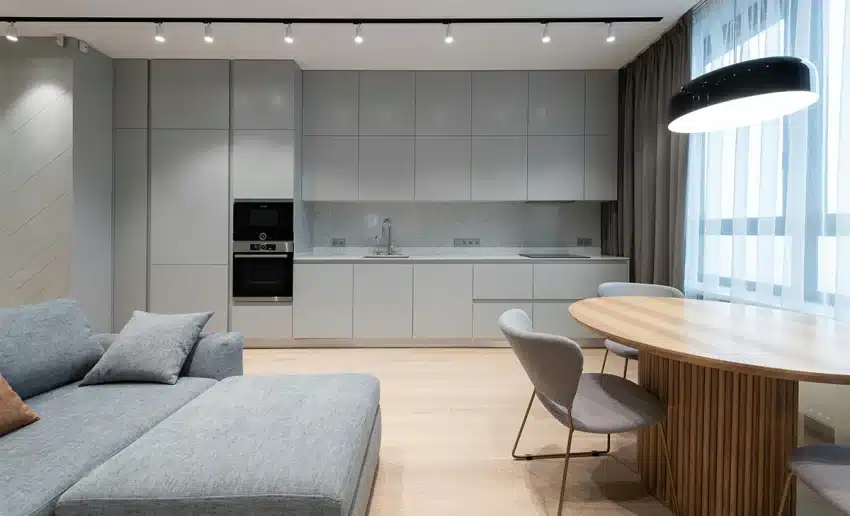 Bedenk hoe de ruimte gebruikt wordt en stem daarop het materiaal af. In een woonkamer met vloerverwarming zijn PVC vloeren ideaal omdat ze dun zijn en warmte goed geleiden. Heb je huisdieren, kies dan voor een slijtvaste toplaag van minimaal 0,55 millimeter. Verder maakt de opbouwhoogte uit bij renovatie. Een dik pakket van hout of laminaat kan deuren blokkeren, terwijl pvc of vinyl dun genoeg is om bestaande dorpels te sparen. Meet daarom de afstand tussen ondervloer en deur voordat je stalen gaat halen. Ook de ondergrond telt. Bij een betonnen basisvloer is een dunne egale laag nodig om deze strak te maken. Bij een houten basisvloer hebben de planken soms speling, kies dan klikpanelen met een geïntegreerde onderlaag om kleine oneffenheden op te vangen.