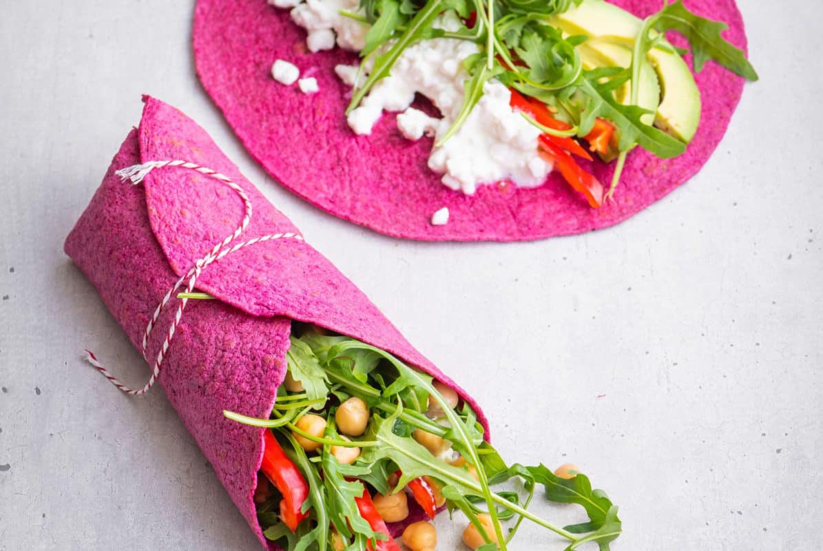 Rode-bietenwraps met cottage cheese, avocado puntpaprika en kikkererwten