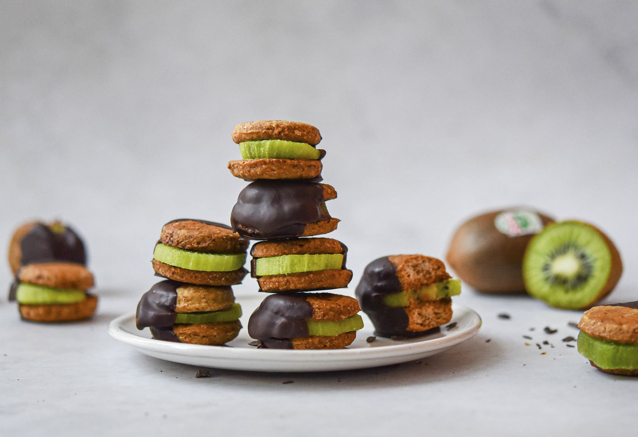 - Wanneer de koekjes volledig zijn afgekoeld, kan je beginnen met stapelen. Koekje – kiwiplakje – koekje. Dip dit nu voor de helft in pure chocolade en leg op een bakpapiertje zodat de chocolade kan uitharden. Eet smakelijk!