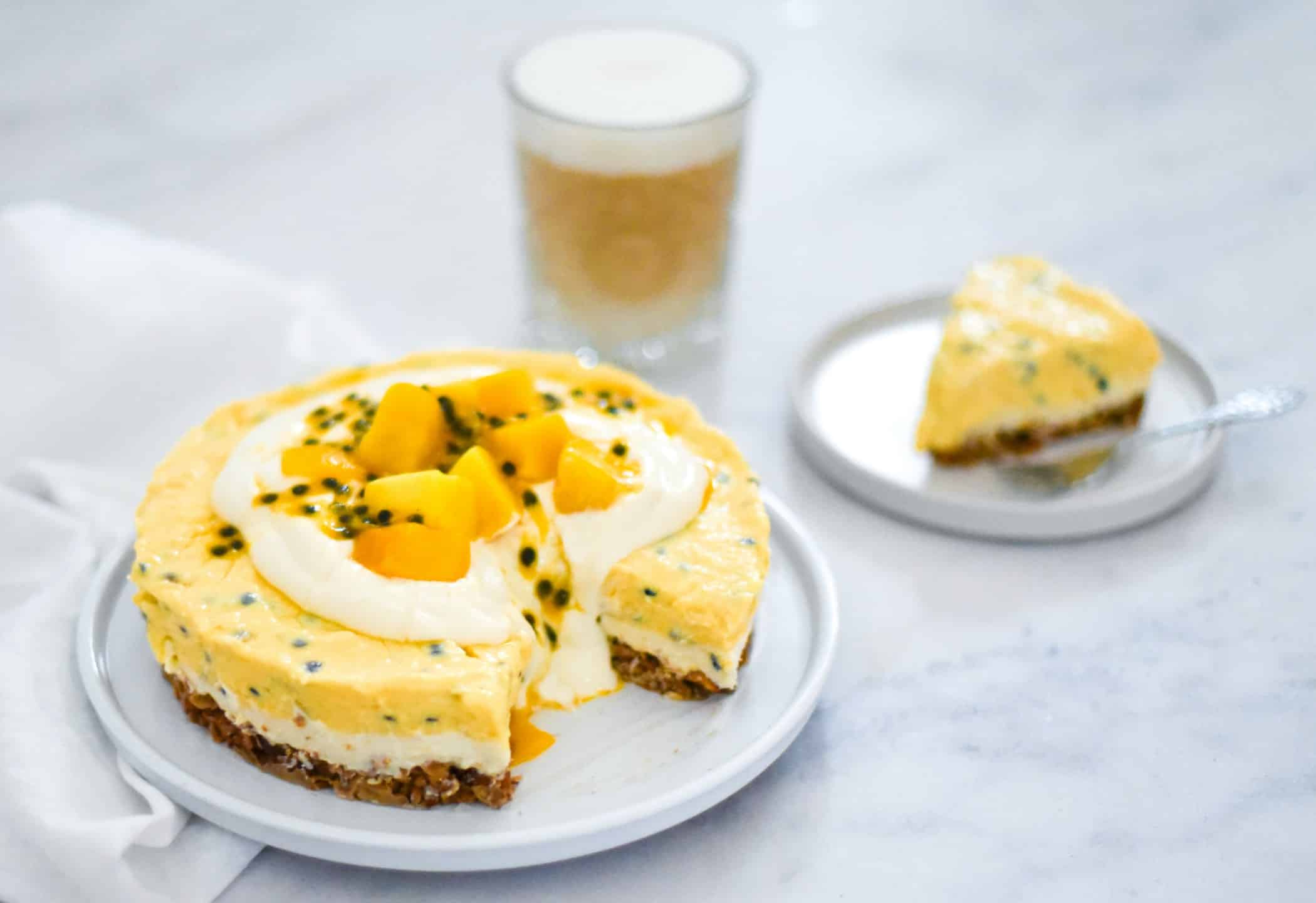 Wat is nou een betere manier om de dag te beginnen dan met een kop lekkere plantaardige flat white en een stukje granola-ontbijttaart met tropisch fruit?