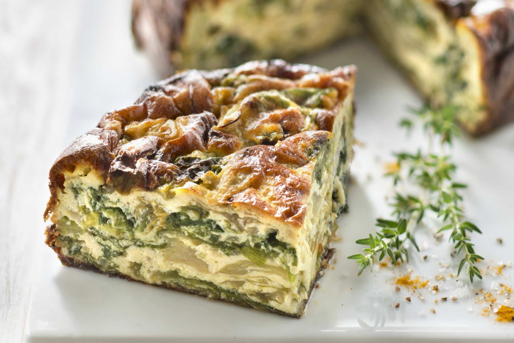 - Bak in de oven ongeveer 40 minuten tot het eimengsel stevig aanvoelt en goudbruin is (test met een satéstokje of het ei is gestold, er mag geen ei aan de prikker blijven plakken).