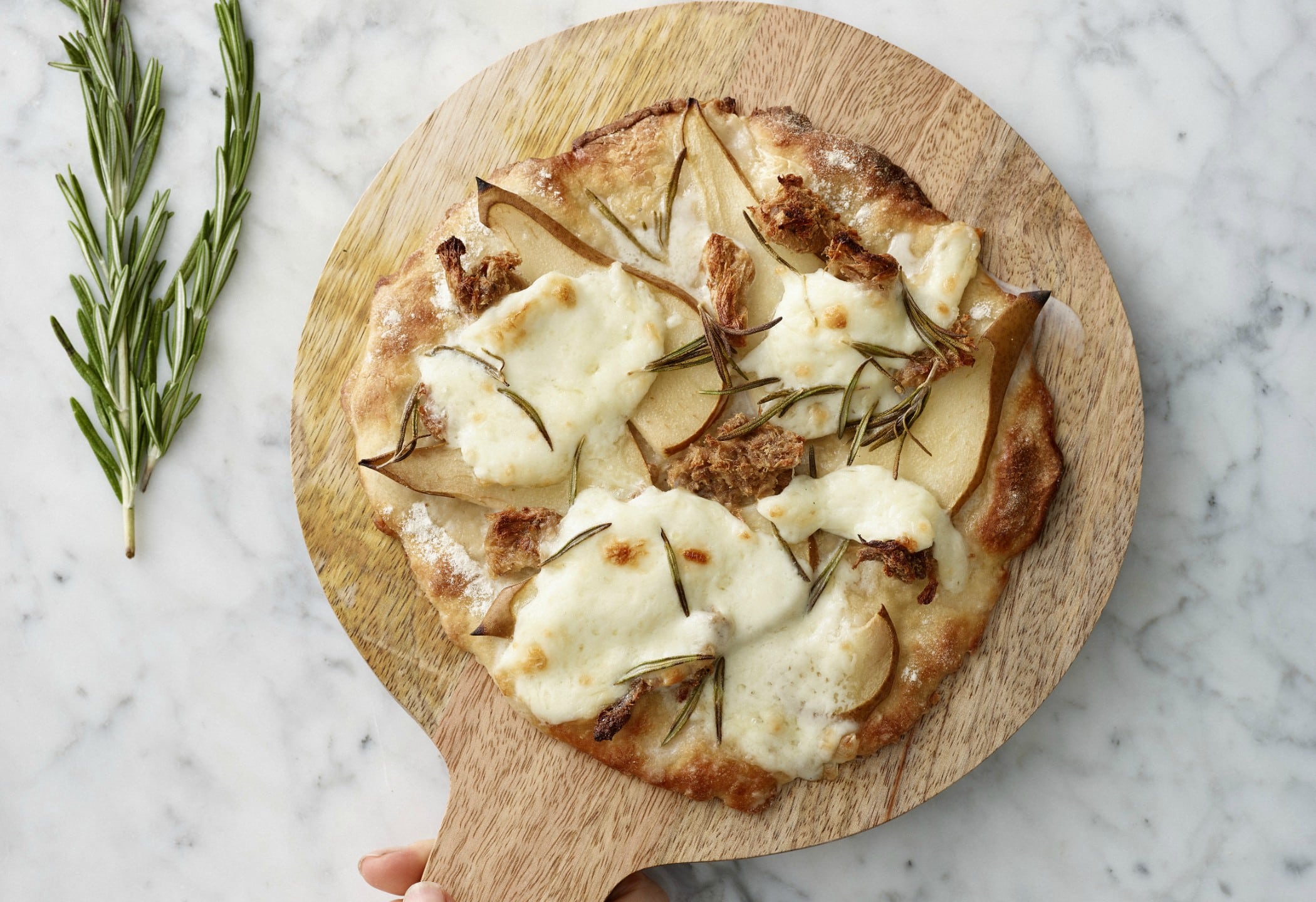 - Smeer de crème fraîche uit over het midden van het deeg. Beleg de pizza gelijkmatig met de plakjes peer, Pulled Oats en plakjes mozzarella. Besprenkel met honing, rozemarijn en zwarte peper. Bak de pizza 10 minuten in de oven, of totdat de korst goudbruin kleurt.