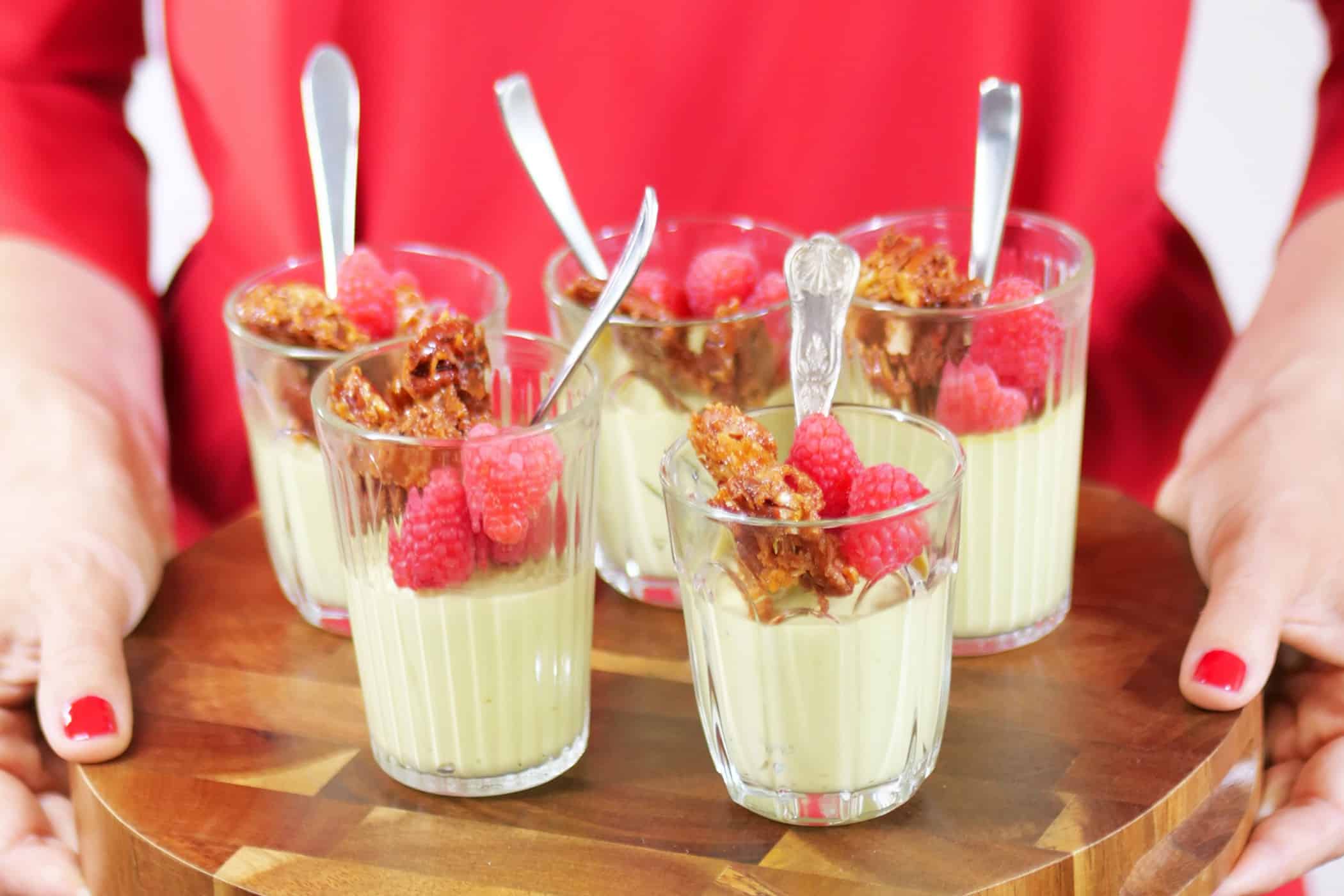 Verwarm de oven voor tot 160 graden en bekleed een bakplaat met bakpapier. Hak de pecannoten grof, meng in een kom met de kokosrasp en honing. Verdeel over de bakplaat en rooster gedurende 10 minuten in de oven. Laat afkoelen en breek in stukjes. Garneer de mousse met de krokante pecannoten en frambozen.