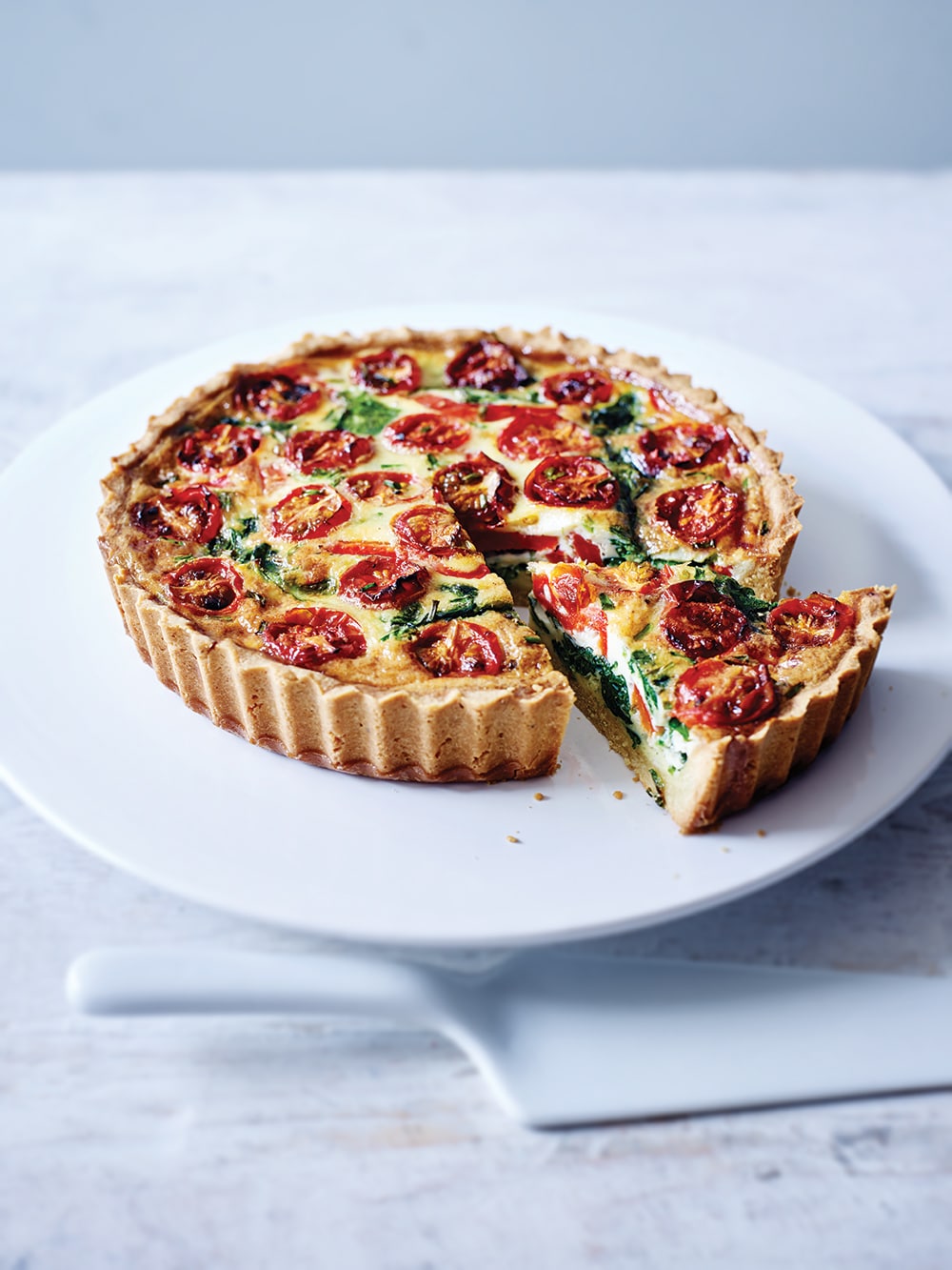 Recept voor quiche met amandelkorst, spinazie, tomaat en rode paprika