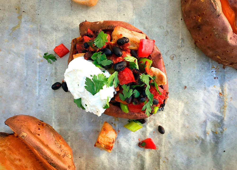 Vegetarisch eten is niet alleen goed voor je lijf, maar ook voor de planeet. Geen idee waar je moet beginnen? Wij delen een heerlijk recept ter inspiratie: Zoete aardappel ‘chicken style’ met zwarte bonen en paprika.