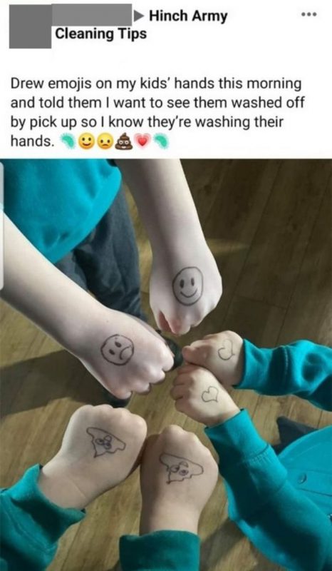 De truc om haar kinderen goed hun handen te wassen is heel simpel en deelde ze op een besloten Facebook-groep: “Ik tekende emoji’s op de handen van mijn kinderen en vertelde hen dat ze er aan het eind van de dag volledig afgewassen moesten zijn.”