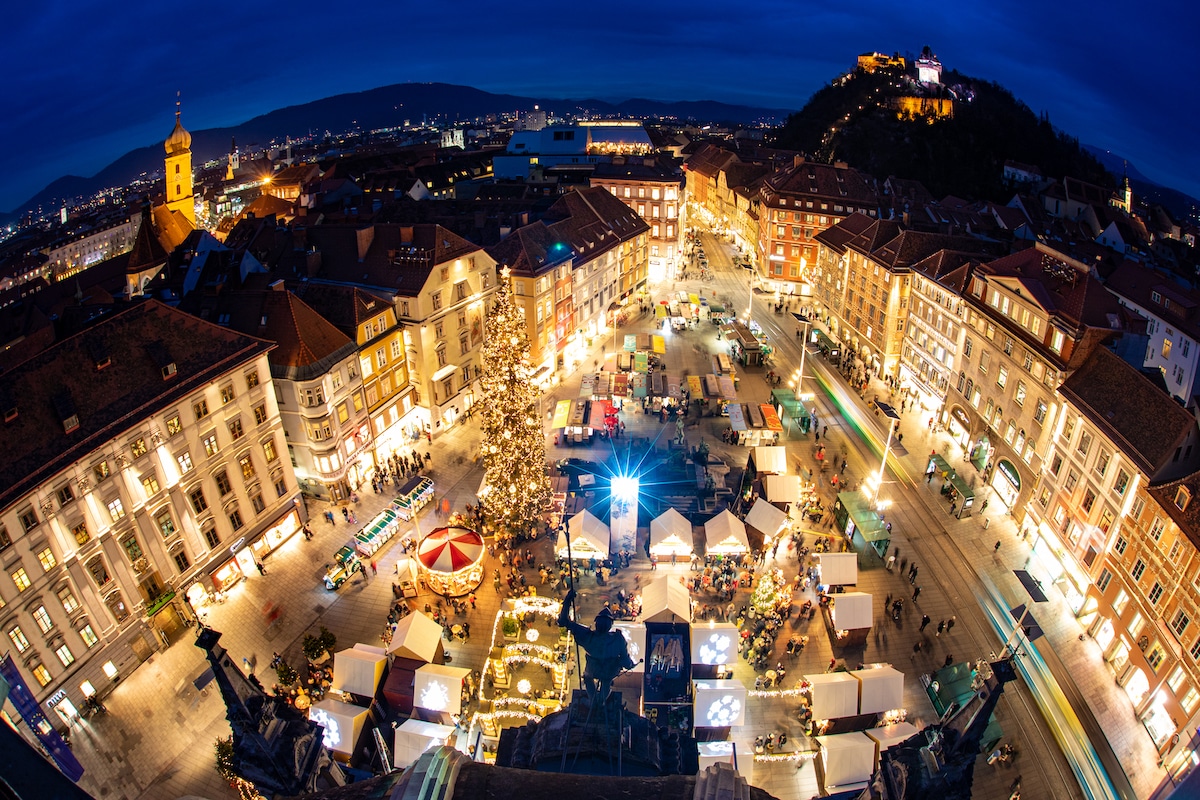 Als je in adventstijd door Graz wandelt, kom je terecht in een waar kerstsprookje. De stad is feestelijk versierd en het is er een schitterend lichtfestijn. Op elke straathoek tref je wel een kerstmarkt, waar je culinaire lekkernijen uit de regio kunt proeven. Neem een kijkje bij het stadhuis, waarop een reusachtige adventskalender is geprojecteerd. Ook de kerststal van ijs in het Landhaushof is een eyecatcher. Die kerststal staat in de adventstijd in het middelpunt van de belangstelling. Het is namelijk ’s werelds allereerste kerststal gemaakt van ijs, en nog altijd de enige met deze omvang. Zelf het ijs op? Ga dan naar Grazer Winterwelt om tegen het decor van de Schlossberg te schaatsen. Tijdens de jaarwisseling staat je in Graz een waar spektakel te wachten van water, vuur, lasers en licht – een onvergetelijke start van het nieuwe jaar!