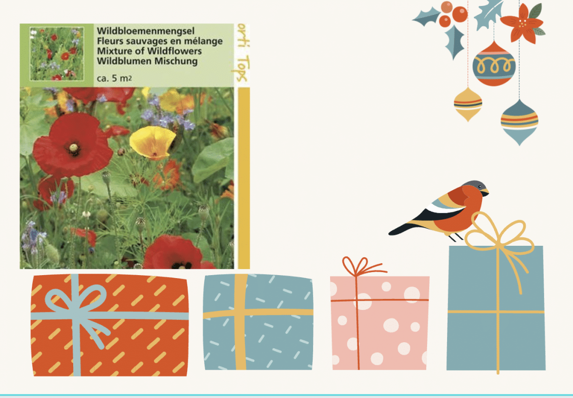 Als je het mooi inpakt, met een bloemetje op het pakpapier geplakt of getekend, geef je iemand een wilde bloementuin. Ook te zaaien in een plantenbak.