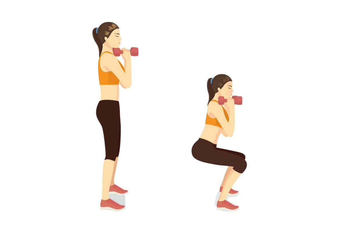 Plaats je voeten uit elkaar, iets verder dan schouderbreedte. Houd een dumbbell dicht bij je borst. Zak door je benen tot je ellebogen je knieën raken en je billen gelijk zijn aan je knieën. Houd je hoofd en borst omhoog en je rug recht. Blijf kort zo staan en duw jezelf met je hakken omhoog tot het gewicht weer bij je borst is. Doe dit 15 keer, rust even en doe nog 2 sets.