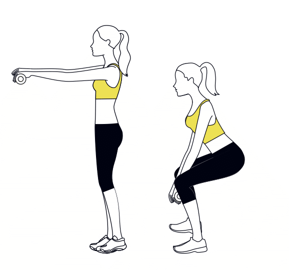Voor deze oefening heb je een dumbbell of kettlebell nodig. Zet je voeten iets verder dan heupbreedte, houd het gewichtje met beide handen vast en strek je armen voor je uit. Laat de dumbbell nu naar beneden zakken, tussen je benen door naar achteren. Hierbij zak je iets door je benen, maar houd je je rug recht. Let op: het heen en weer swingen van de dumbbell doe je voornamelijk met de kracht vanuit je benen en core. Gebruik je armen en schouders zo min mogelijk.